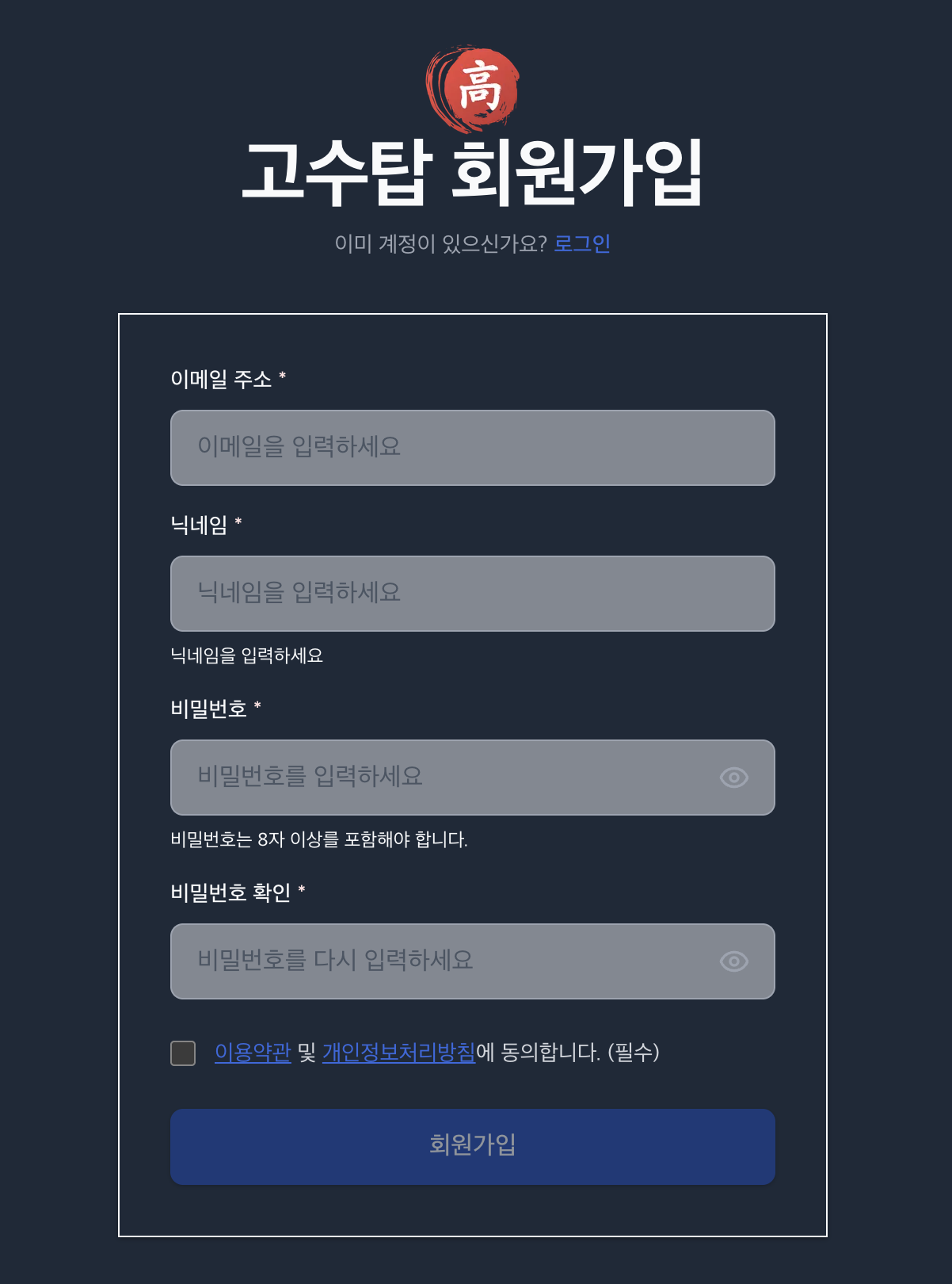 기존 고수탑 회원(아이디로 가입한 경우)은 기존 아이디 로그인 후 이메일을 등록하면 기존 데이터를 그대로 이용할 수 있습니다.