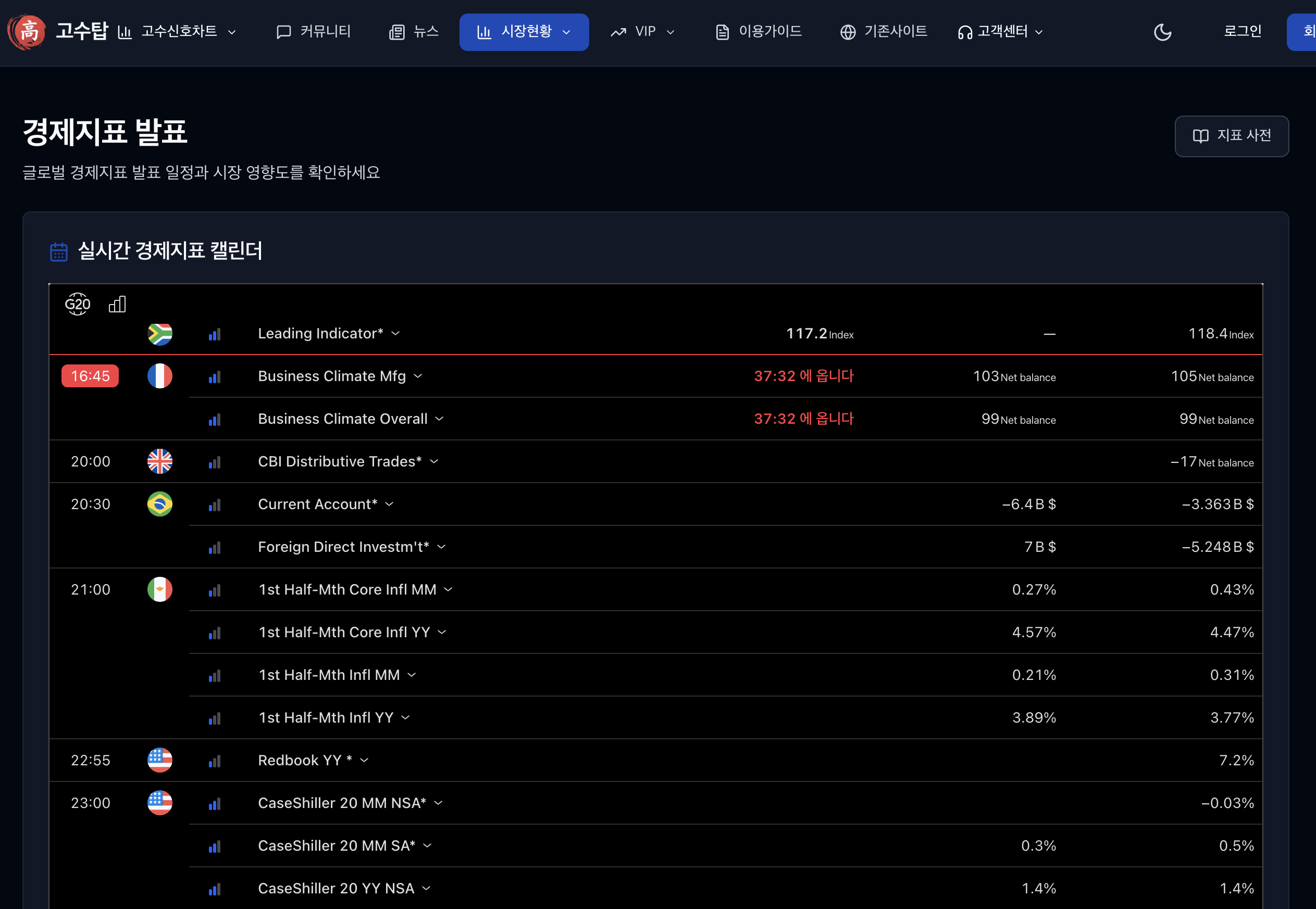 - 중요도 필터: “중요도가 높은 것만” 토글하여 시장 영향이 큰 지표만 필터링할 수 있습니다.