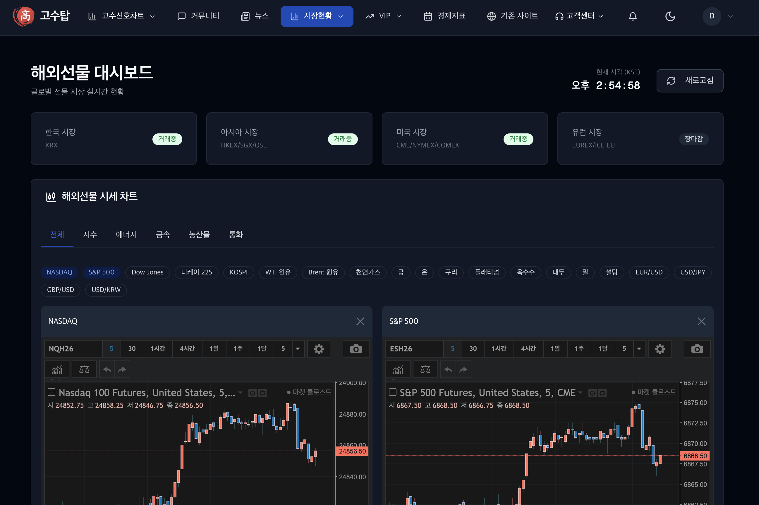 글로벌 선물 시장의 실시간 시세와 분석 도구를 제공하는 대시보드입니다. 모든 회원이 무료로 이용할 수 있습니다.